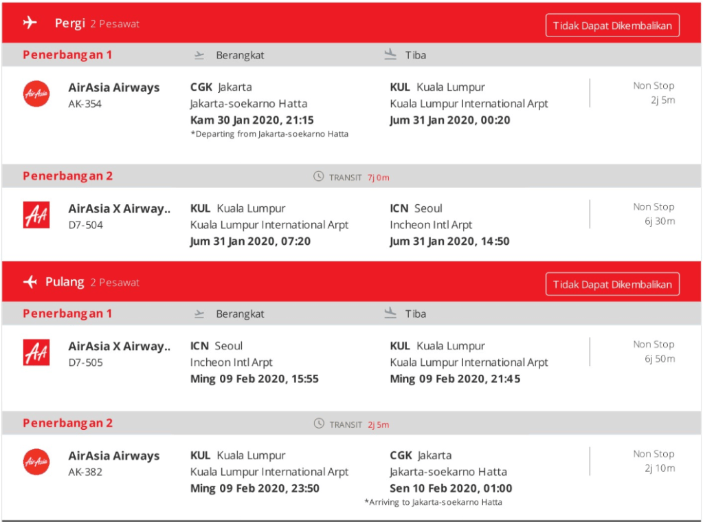Tambahan informasi, sebenarnya bukannya ga ada penerbangan direct ke Incheon, masalahnya dengan jadwal yang sama harganya sampai IDR 24 juta, kan lumayan selisih ampe IDR 10 juta mah, lalu gimana dengan penerbangan yang full facility? Ada juga sudah plus bagasi 30kg per orang, in flight meal and entertainment, tapi sama itu juga harus transit, dan beda harga sampe IDR 4-5 juta