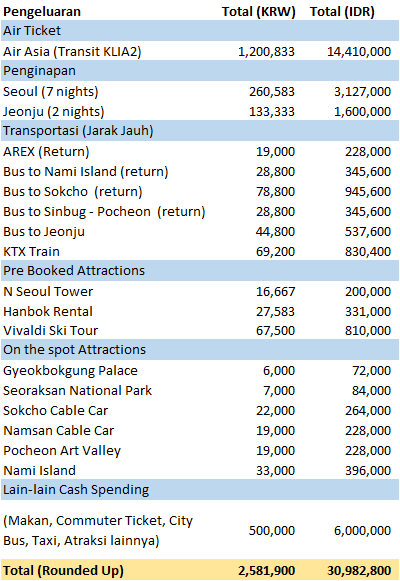 Berikut rincian biaya perjalanan ke Korea Selatan meliputi 2 kota singgah, Seoul dan Jeonju, serta wisata ke beberapa kota di Sokcho, Sinbug (Pocheon), dan Gapyeong (Nami Island), serta Vivaldi Ski Resort. Biaya ini adalah untuk kami bertiga.
