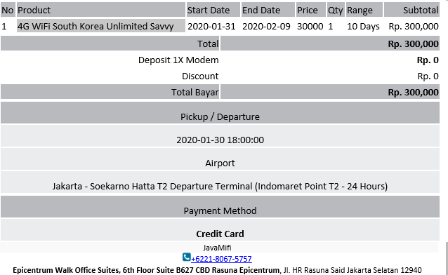 Selama perjalanan di Korsel, kami memilih menggunakan mobile wifi dari JavaMifi, paket yang kami gunakan adalah paket 1 GB/hari, 4G WiFi South Korea Unlimited Savvy, sebesar IDR 300,000 untuk 10 hari, kalau bayar cash harus deposit, jadi saya bayar pake credit card supaya ga perlu deposit.