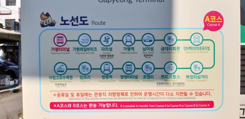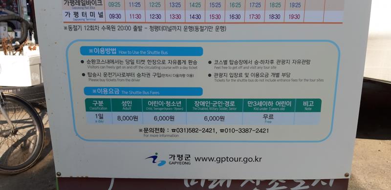 Ini bus yang melayani keliling area Gapyeong dari gerbang masuk Nami Island, Le Petite France, dan Garden of Morning Calm, biaya naik bis ini adalah KRW 8000/orang dan untuk anak-anak KRW 6000/orang, dan berlaku selama 1 hari kamu bolak-balik di area ini, masing-masing lokasi wisata punya tarif masuk yang berbeda-beda.