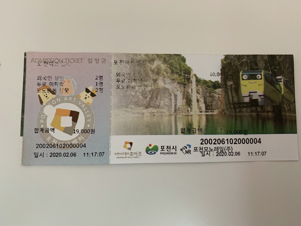Tiket masuk Pocheon Art Valley adalah sebesar KRW 5000/orang dan round trip cable car ticket sebesar KRW 4500/orang, anak balita free, jadi total tiket masuk adalah KRW 19,000 ~ IDR 228,000 untuk 2 orang, dapat free 2 gelas kopi yang bisa kami tukar di cafe di dalam Pocheon Art Valley.
