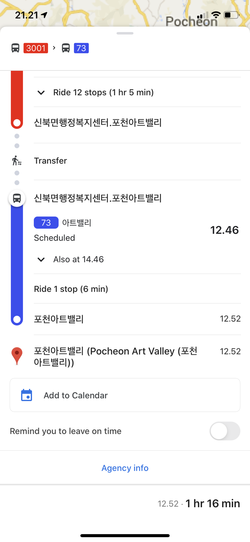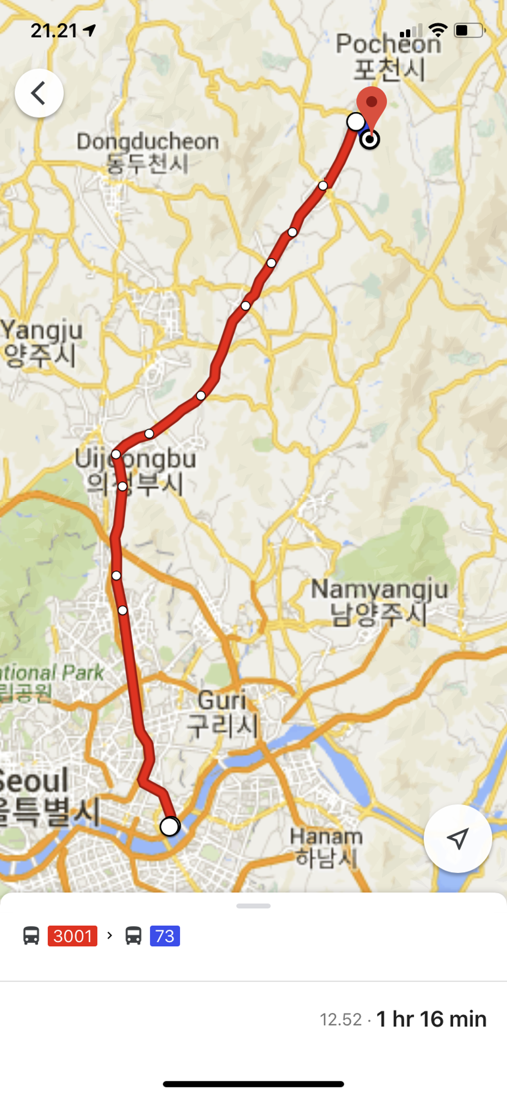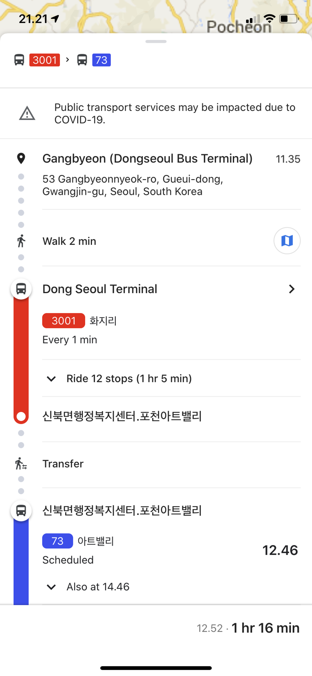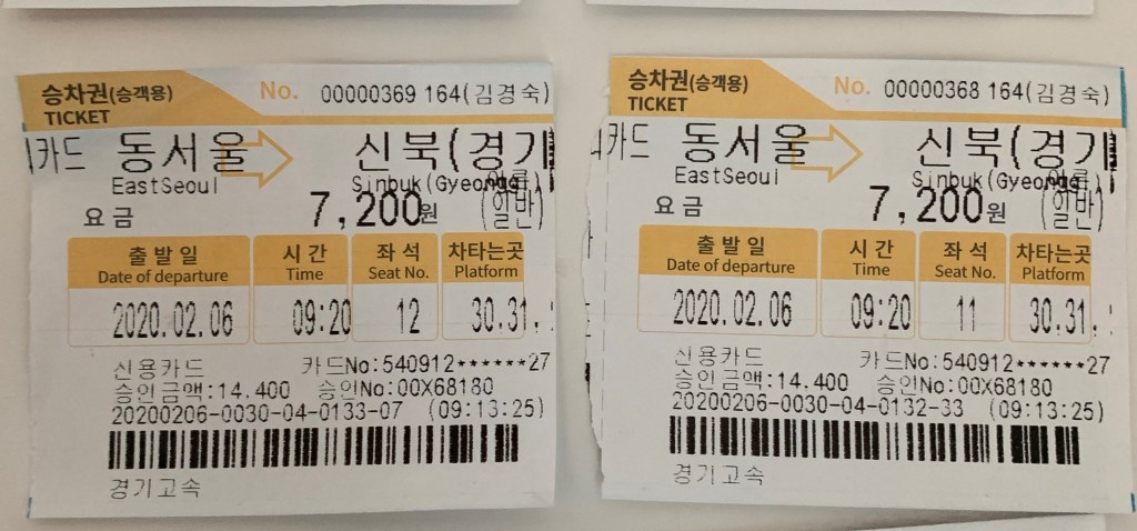 Kami kembali menggunakan bus antar kota dari Seoul ke arah Pocheon, berbeda dengan tujuan kota-kota sebelumnya, kali ini bus tidak berhenti di terminal tujuan akhir untuk ke Pocheon, yang ada adalah kami turun di halte bis di kota Pocheon, dengan membeli tiket dari Dongseoul bus terminal ke tujuan Sinbuk, biayanya sebesar KRW 7,200/orang, biaya yang sama saat kami pergi ke kota Gapyeong untuk ke Nami Island.